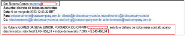 Um desses clientes é Rubens Gomes, o Rubão, que assumiu a diretoria de futebol do Corinthians em janeiro. Após a condenação de Antonio e Fabrícia pela 4ª Vara de Campina Grande/PB, em fevereiro de 2023, o casal fugiu e entrou na lista de procurados da Interpol. Dias depois, em 9 de março de 2023, Rubão, em um ato de desespero, tentou sacar R$ 3,6 milhões que mantinha em custódia de Bitcoins na Braiscompany. Abaixo está o e-mail enviado por ele à empresa: