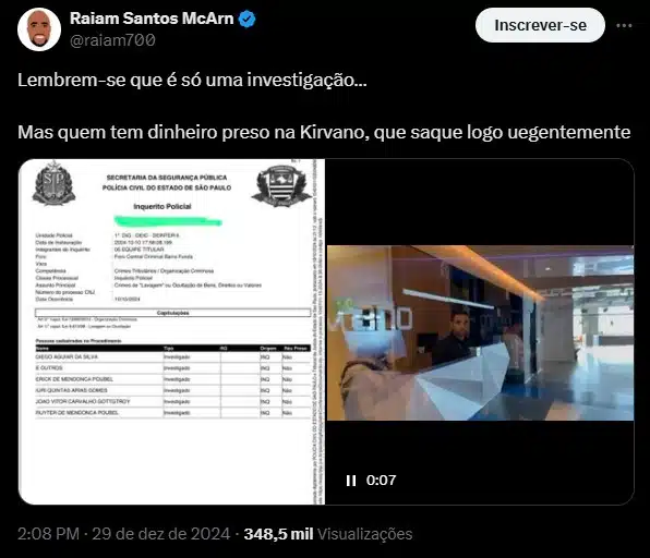Raiam Santos divulga investigação contra Kirvano, plataforma de marketing de afiliados de Diego Aguiar e Ruyter