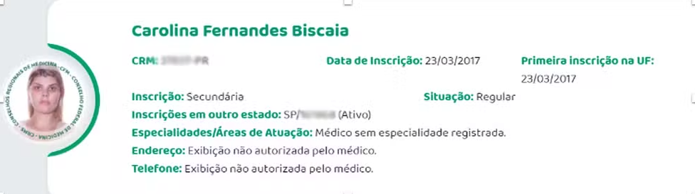 Ao consultar o site do conselho por meio dos números de registro profissional de Carolina no Paraná e em São Paulo, não há especialidades reconhecidas em nome dela. Nas redes sociais, contudo, a médica se apresentava como dermatologista.