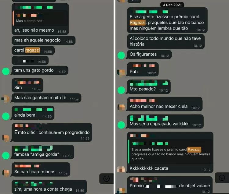 Em 2021, Ragazzi teve acesso a mensagens de WhatsApp entre colegas de banco. Nelas, era chamada de “gata gorda” e sugeriram criar um “prêmio Carolina Ragazzi” para funcionários considerados inúteis.