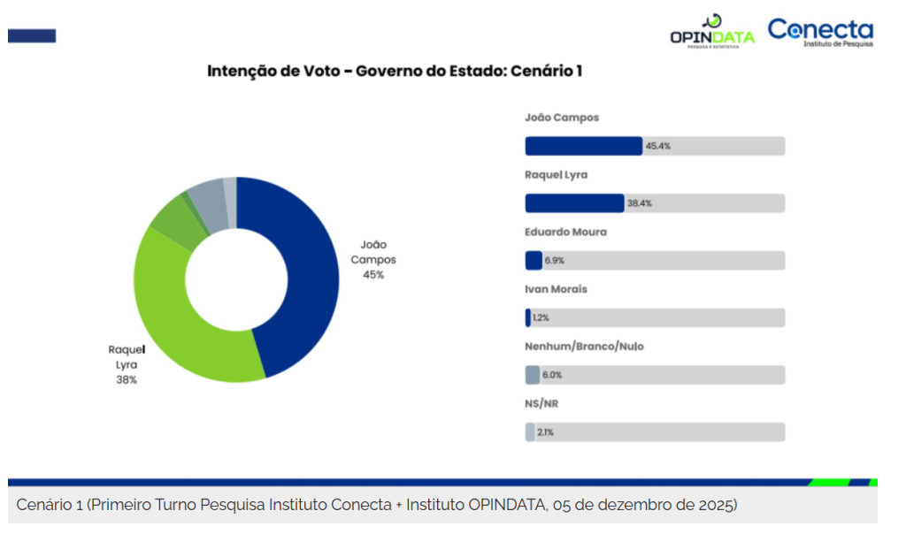 A mais recente rodada de pesquisas eleitorais realizada pela CONECTA Pesquisas, em parceria com o Instituto OPINDATA, entre 1º e 5 de dezembro de 2025, detalhou o cenário para a disputa ao Governo de Pernambuco em 2026. O levantamento, divulgado com exclusividade pelo portal Jamildo.com nesta sexta-feira (05), utilizou uma ampla amostra de 10 mil entrevistas online e mostra que a polarização entre o prefeito do Recife, João Campos (PSB), e a governadora Raquel Lyra (PSD) se mantém — porém com diferença menor entre os dois.