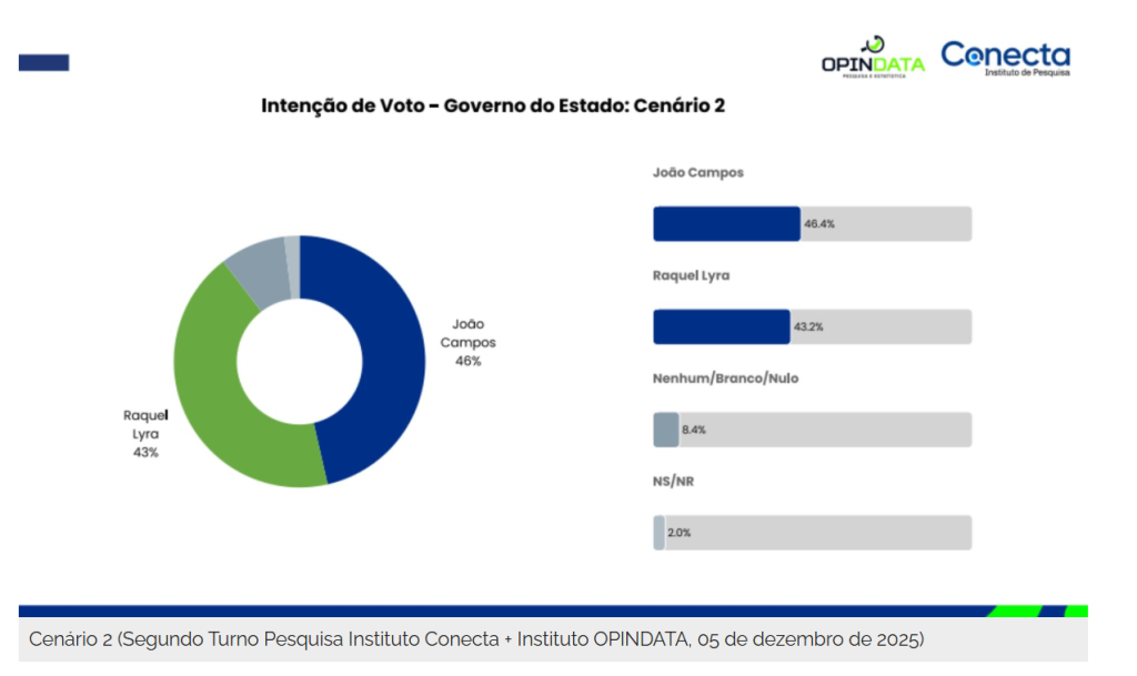 Pesquisa CONECTA/OPINDATA mostra João Campos com 46% e Raquel Lyra com 43% no segundo turno, reduzindo a diferença para apenas 3 pontos percentuais e acirrando a disputa pelo Governo de Pernambuco.